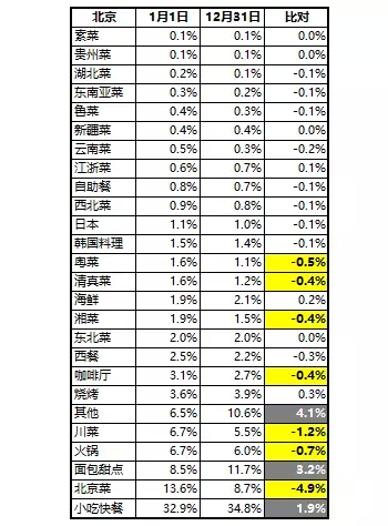 北京菜严重缩水,其他类扩大,面包甜点品类扩大 。
