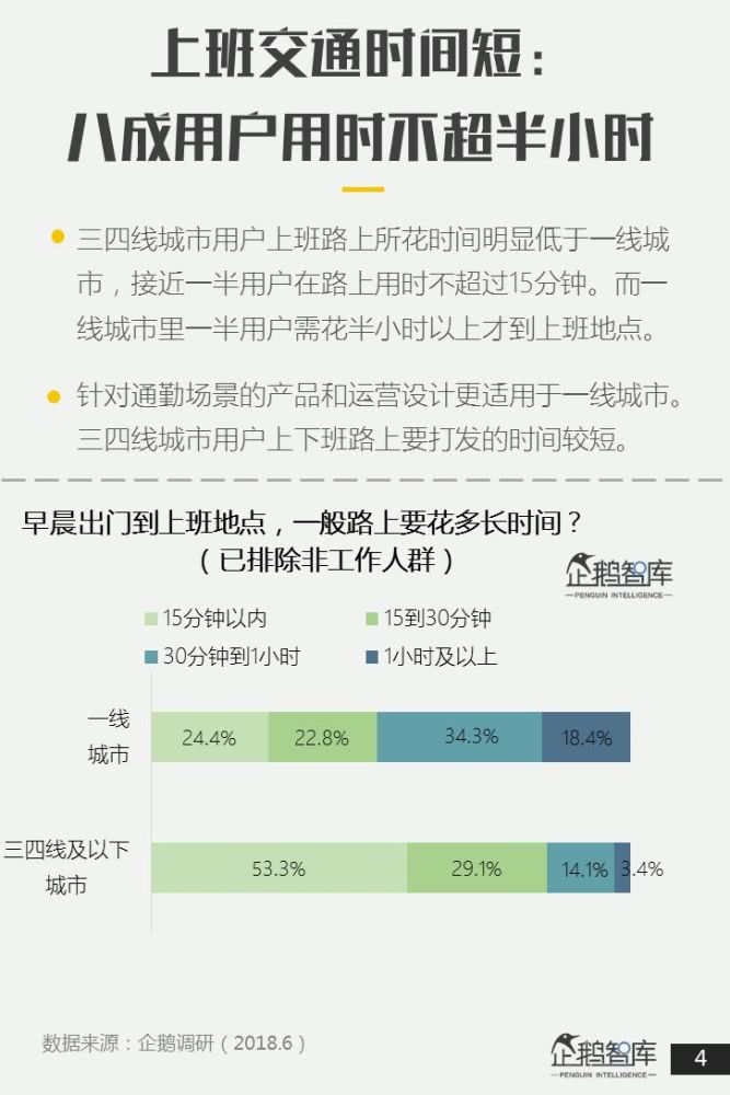 红利还有一些, 但也只是还有一些了。 时至今日,三四五线城市网民在整体移动网民中的占比已经超过了一半。 从过去一年以来的互联网趋势看,新崛起的商业新贵和创新产品,大部分身上都有着鲜明的“用户下沉”特征。 ——是的,中国互联网人口红利在最优市场已经触顶。也正因为如此,如何快速的去掌握三四五线城市网民特征和需求,成为了目前最被关切的话题。 对比我们熟悉的一线城市,三四五线城市网民的生活方式差异,究竟体现在哪些方面?如何更好地满足不同类型城市人群的差异化需求? 为此,企鹅智库旗下智酷研究中心,基于企鹅智库企鹅调研平台和企鹅智库产品预研中心所提供的精准数据,从三四五线城市网民的时间支配、收入支配、网上娱乐消费三方面,研究发布了这份《中国三四五线城市网民时间&金钱消费数据报告》。 在符合统计学代表性前提下,共抽样出4698名普遍性网民参与了此次调研,其中一线城市用户900名(对比用),三线城市用户959名,四线城市用户1922名,五线及以下城市917名。 报告中的部分核心发现如下: 1.三四五线城市用户上班路上所花时间明显低于一线城市。接近一半的三四五线城市用户在路上用时不超过15分钟。而一线城市里一半用户需花半小时以上才到上班地点。 2.三四五线城市用户的上班时间整体早于一线城市。早晨8点时,已经有超过60%的人进入上班状态。 3.上网主要靠手机,电脑使用率远低于一线城市。刷手机在70%左右的三四五线网民的闲暇时间占比里,都超过了一半。其中,女性和年轻用户网民中,该类用户的占比更高。 4.日常支出中,饮食和购物占比高,这一点和一线城市表现一致。但三四五线城市里,教育支出的占比要高于住房支出。 5.三四五线城市的网民中,也已经有41.8%用户表示主要在网上购物,虽然低于一线城市的51%,但整体差距并不悬殊。 6.晚上下班回家后的手机娱乐项目里,对短视频和网络小说的喜欢程度上,三四五线城市明显高于一线城市。且三四五线愿意为网络小说付费的人群也高于一线城市。 7.对比网上娱乐消费人群的消费金额,三四五城市在网上娱乐的消费能力不因收入规模低于一线城市而产生缩减。 8.用户对娱乐的需求永远待填补。约70%的三四五线用户认为,虽然手机里好玩的东西还行,但有时还是会觉得无聊,不知道还能做什么。 以下是报告的详细内容: